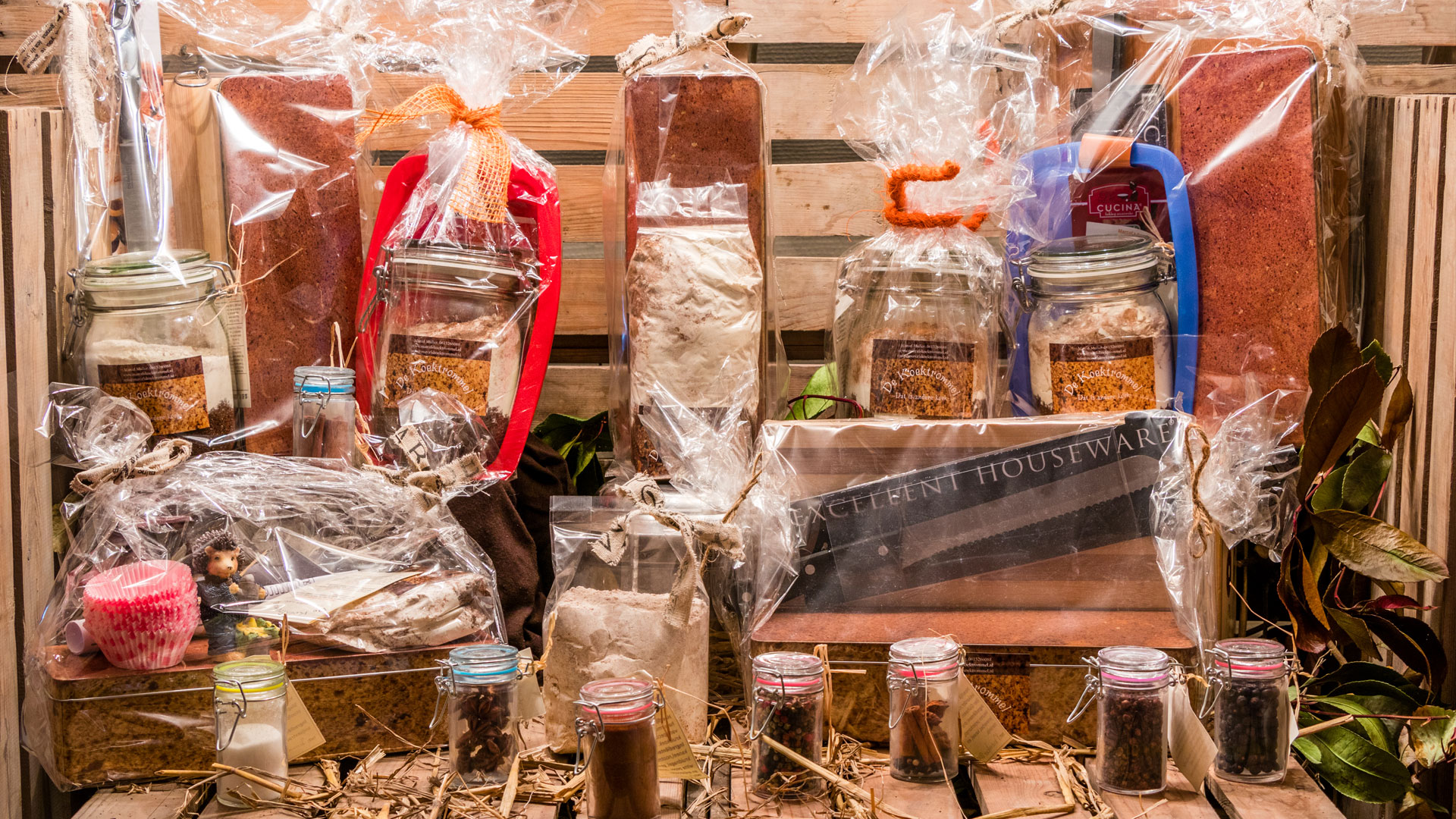 Met daarbij in een leuk pakket verpakt ook een koektrommel met koekmotief, broodmes en bamboe snijplank zit.